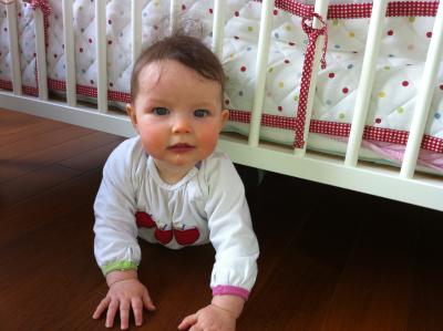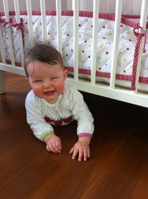 Sie übt sich ansonsten im Krabbeln, aber momentan robbt sie mehr - und das meist rückwärts. Da weiss man dann leider nie, wo man landet. Z.B. unterm Bett: