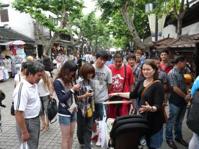 Während wir von der Stadt nur mäßig beeindruckt waren, waren die Chinesen jedoch stark von unserer Hannah beeindruckt. Ständig waren Gruppen um den Kinderwagen versammelt, die Hannah bewundert und sogar fotografiert haben: